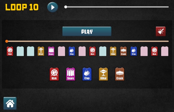 Listen to the music loop, then recreate it by placing the correct sounds on the correct beats (drag & drop them).